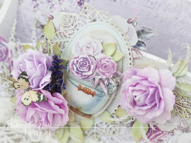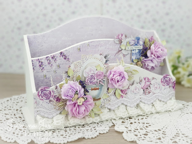I have altered a desktop organizer, to make my workspace prettier. For this project, I have chosen My sweet Provence paper collection. Beautiful papers in shades of violet.